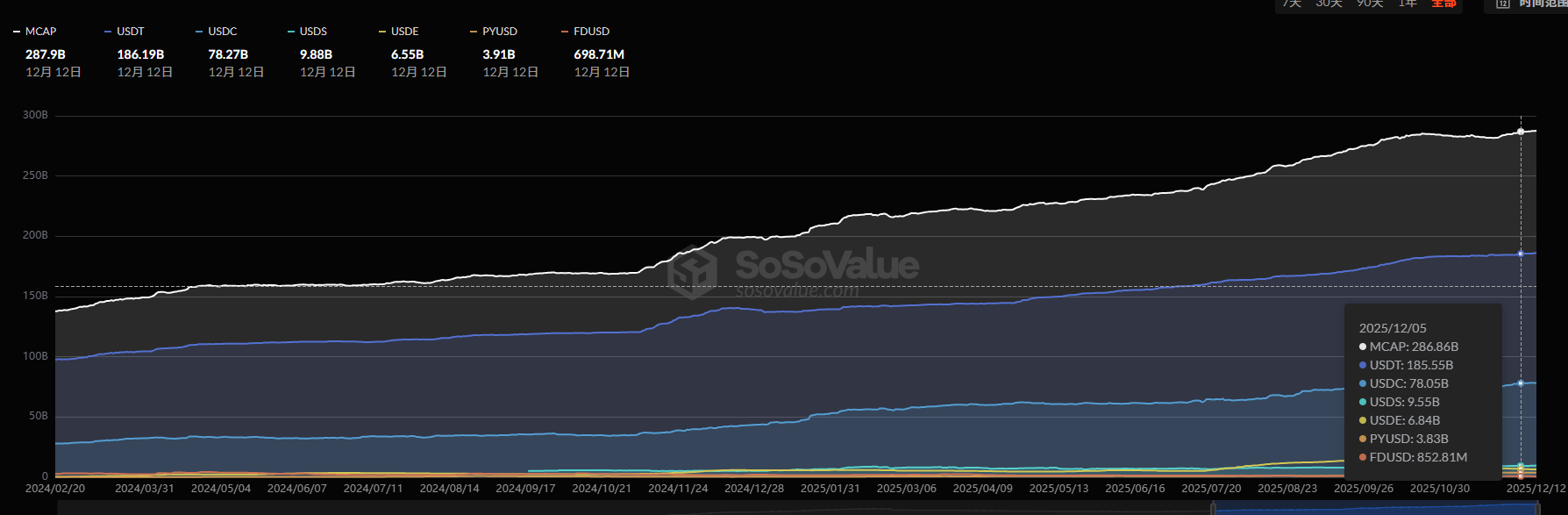 - 稳定币总市值 2879 亿美元,环比上升 0.35%,法币支持稳定币净流入 7 亿美元。