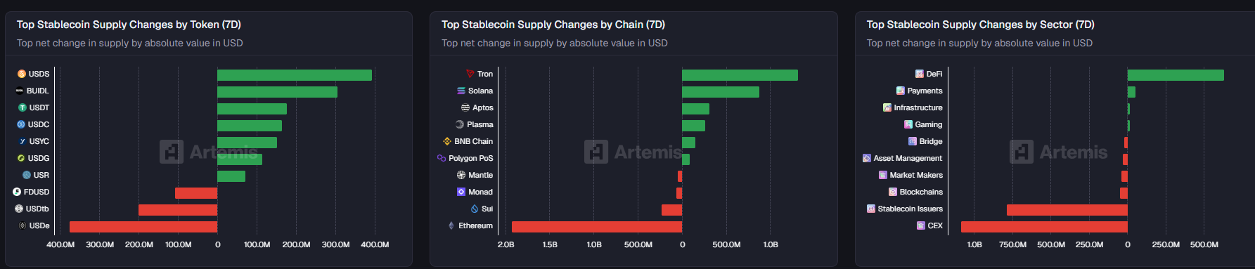 - 资金流动:USDT、USDC 增发领先,USDE 大幅流出;CEX 资金持续流出,反映短期情绪回暖但仍偏谨慎。