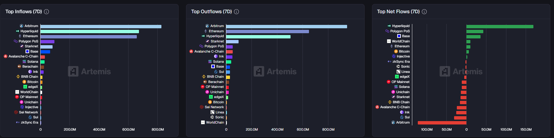 - 资产流向:DeFi 桥接资产净流入最多为 Hype 链,流出最多为 Arb 链;巨鲸在 Hype 链开单增多,情绪边际改善。