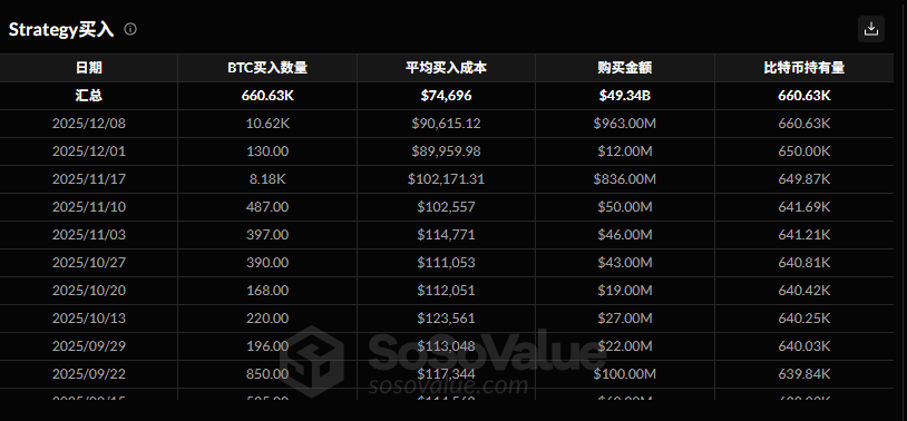 12 月 8 日,微策略斥资 9.63 亿美元,以 90615.12 美元的平均成本购入 10620 枚比特币。截至目前,其累计持有 BTC 总量达 66.063 万枚,占比特币总供应的 3.309%,为市场提供底部支撑。