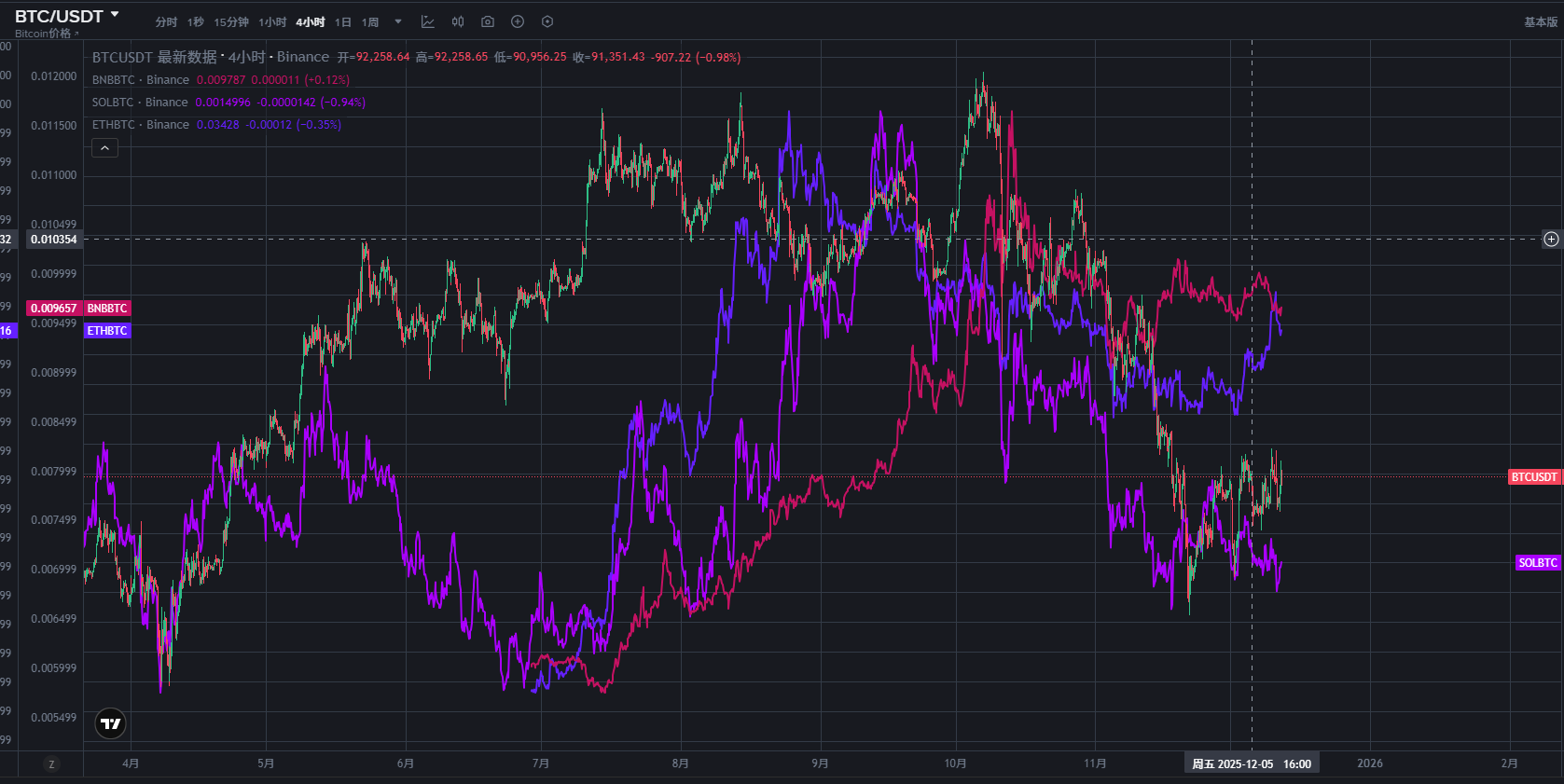 - 汇率走势:ETH/BTC 汇率明显走高,ETH 买盘强劲,带动生态代币脉冲式上涨,但持续性不足;SOL/BTC、BNB/BTC 走势相对平稳。