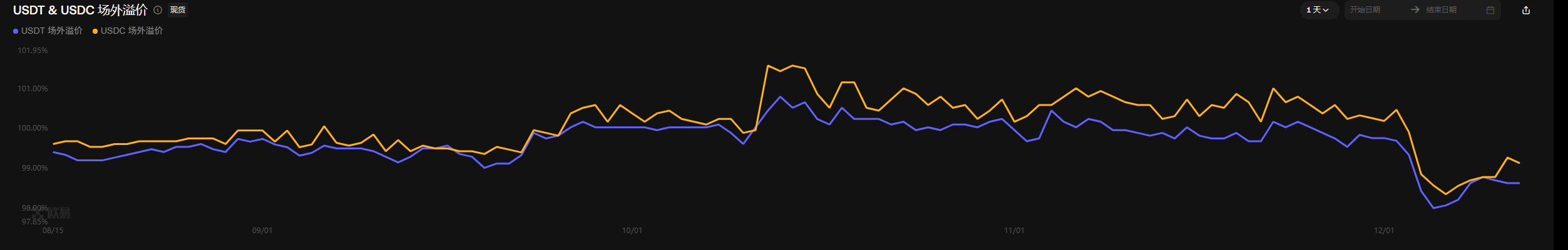 USDT 与 USDC 场外溢价率小幅反弹,显示资金流出的恐慌情绪有所缓和,但整体仍处于偏低的负溢价水平,市场整体情绪尚未完全回暖。