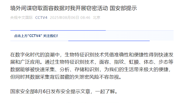 2025年8月6日——中国国家安全部发布警告,指出一家外国公司以发行加密货币代币为幌子,在全球范围内收集虹膜数据,严重威胁个人信息安全乃至国家安全。此举引发了市场震动,并加剧了人们对生物特征数据隐私的关注。