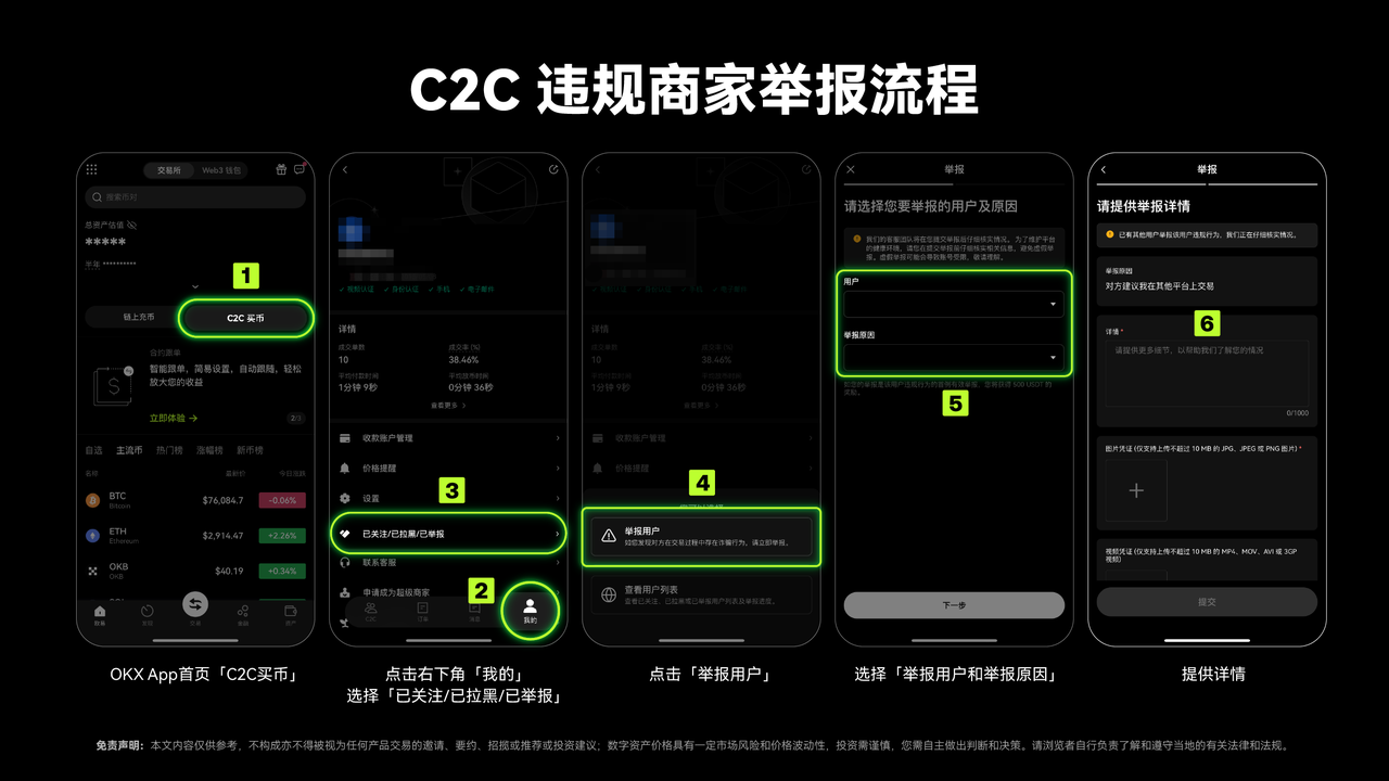 一旦用户遭遇上述体验不好的交易,甚至是非实名付款等违规交易与欺诈风险,可以向OKX C2C客服寻求帮助,或者第一时间进行举报。