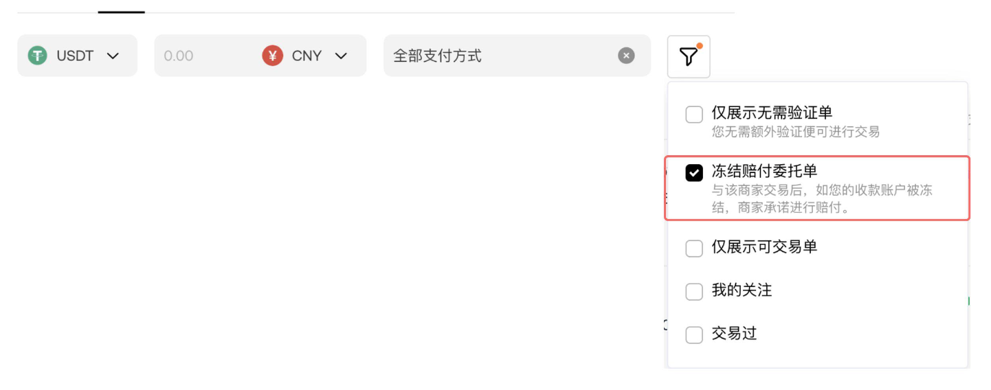 此外,为了方便用户选择,OKX在C2C交易界面增加了专门筛选功能。用户也可以在筛选功能中,直接选择与“冻结赔付”商家进行交易,更快捷更安心。