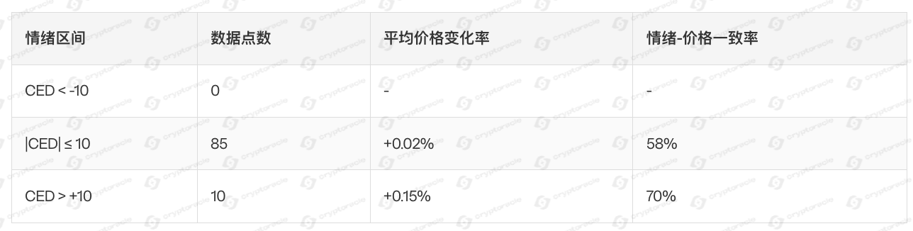 趋势结论:情绪极端正值阶段(CED>10)价格表现相对积极,情绪-价格一致率达到70%,且平均涨幅明显高于中性区间。这表明在当前周期内,情绪极端化更倾向于推动价格上行而非反转。