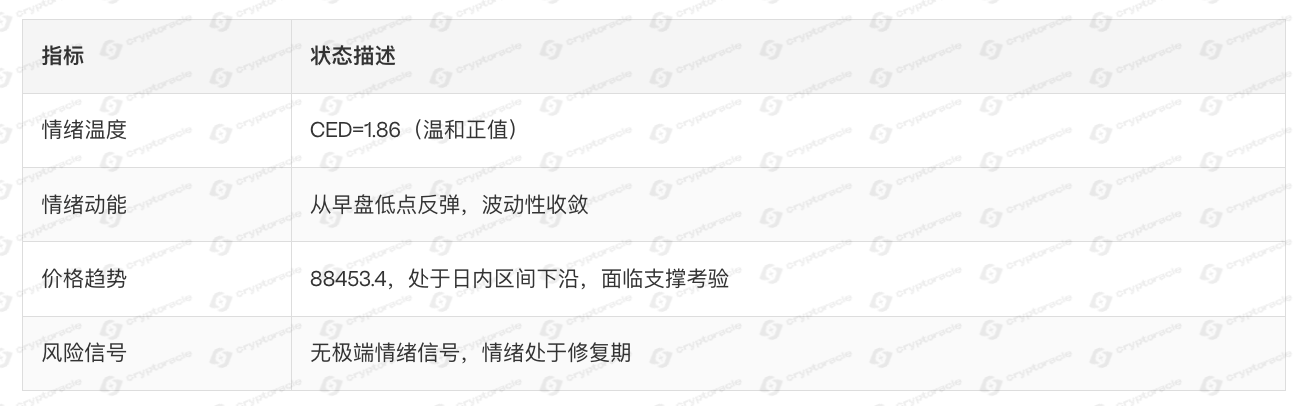 当前市场情绪处于温和修复状态,从昨日晚间低点有所回升但力度有限。价格在88400附近寻求支撑,情绪与价格方向一致性一般。短期预计维持震荡格局,需关注能否有效突破88800阻力位。情绪指标显示市场参与者态度谨慎,缺乏明确的单边动能。