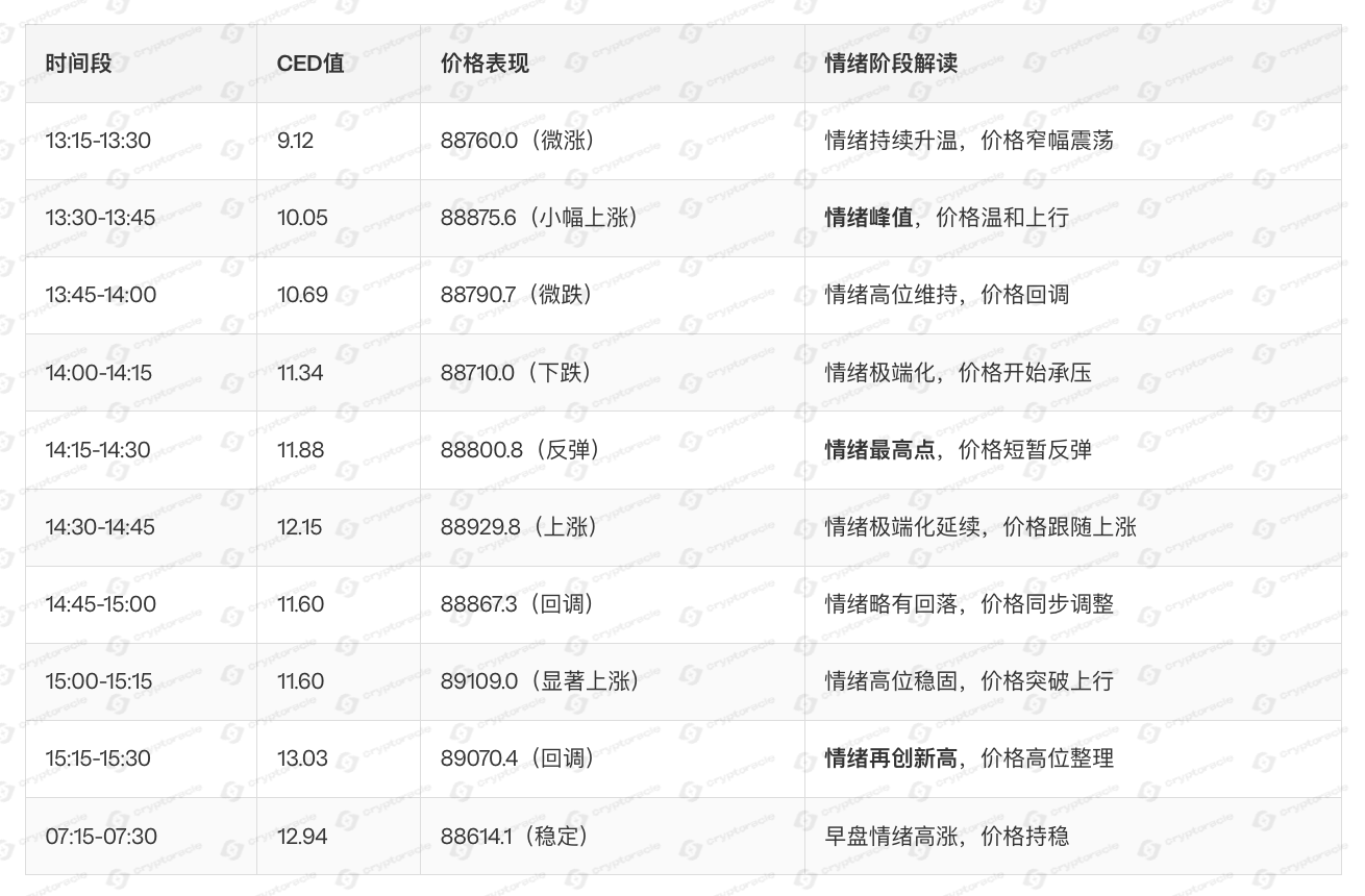 日内情绪节奏:上午情绪从深度负值快速修复,午后达到情绪高峰(CED>10持续约3小时),晚间情绪逐步降温并回落至负值区间,呈现明显的"午间亢奋、晚间谨慎"特征。