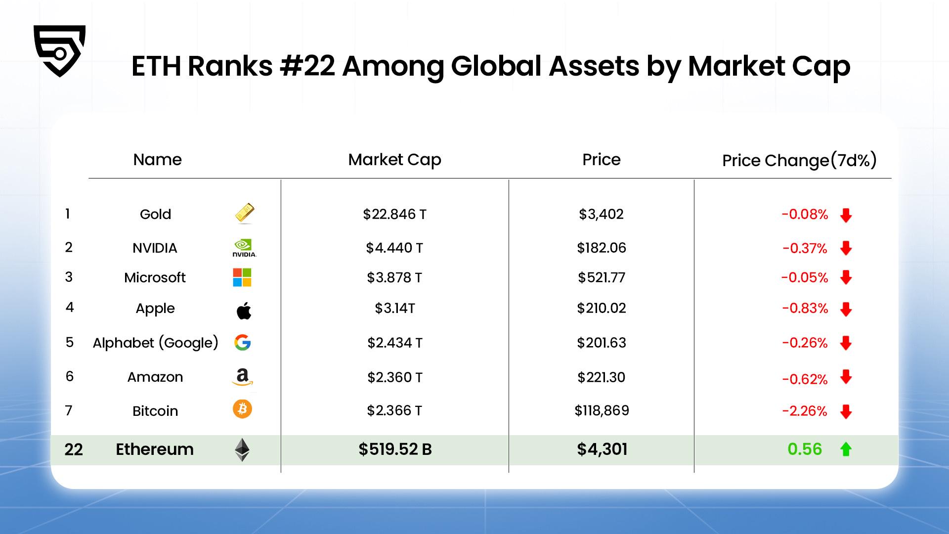 从全球资产市值排名的角度来看,以太坊当前的表现更加令人瞩目。根据最新的市值数据,以太坊以5,205.8亿美元的市值位居全球第22位,这一排名具有重要的标志性意义。