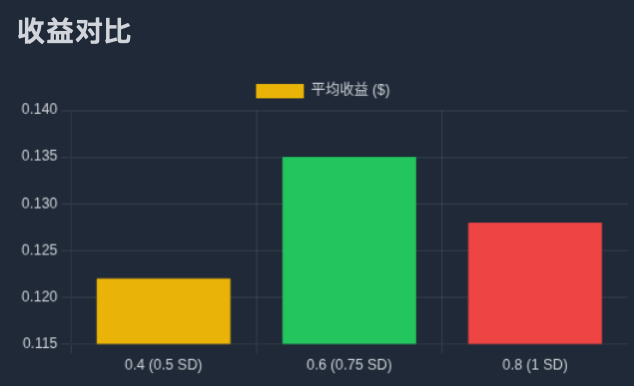 - C. 寻找最优解 通过对不同价差进行迭代计算,可以发现:价差 $0.2 预期收益约 $0.08;价差 $0.4 预期收益约 $0.122;价差 $0.6 预期收益约 $0.135;价差 $0.8 预期收益约 $0.128。结论是在此模型下,最优价差为 $0.6,即在距离均价 $0.3 (约 0.75σ) 的位置挂单,能实现期望收益的最大化。
