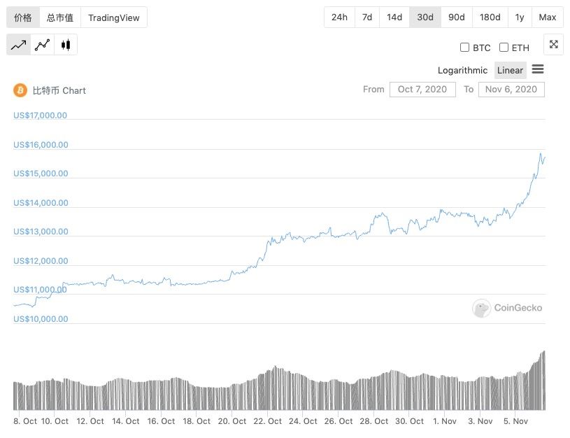 PANews 11月6日消息,美国大选期间,比特币价格迎来持续上涨。CoinGecko数据显示,目前比特币为15734美元,近一个月涨幅达48.4%。