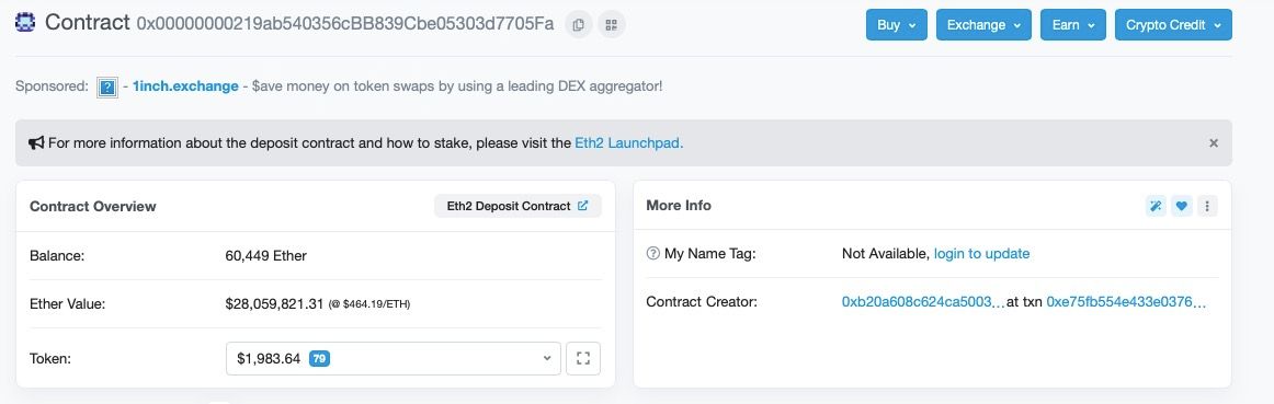 PANews 11月13日消息,Etherscan数据显示,目前以太坊 2.0 存款合约地址共收到60449枚 ETH,价值超1983.6万美元。