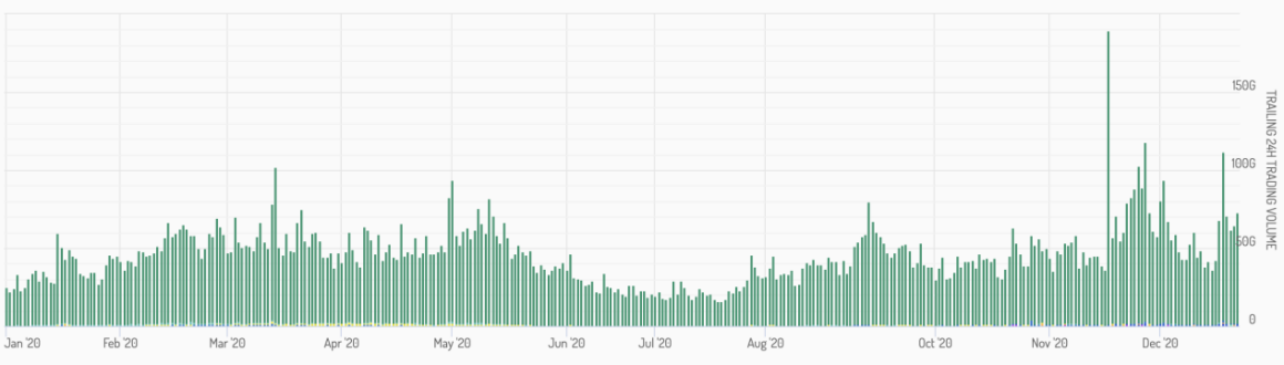 根据MESSARI对稳定币数据的监测,截至12月22日,稳定币的日交易量约为714.87亿美元,较1月1日增长约183.63%。其中,最大的稳定币USDT今年的日交易量已经增长了187.65%。11月中旬以后,稳定币日交易量有显著放量,11月17日的峰值达到了1893.07亿美元,但就增长趋势而言,币价上行态势较稳定币交易量增长态势更显著。