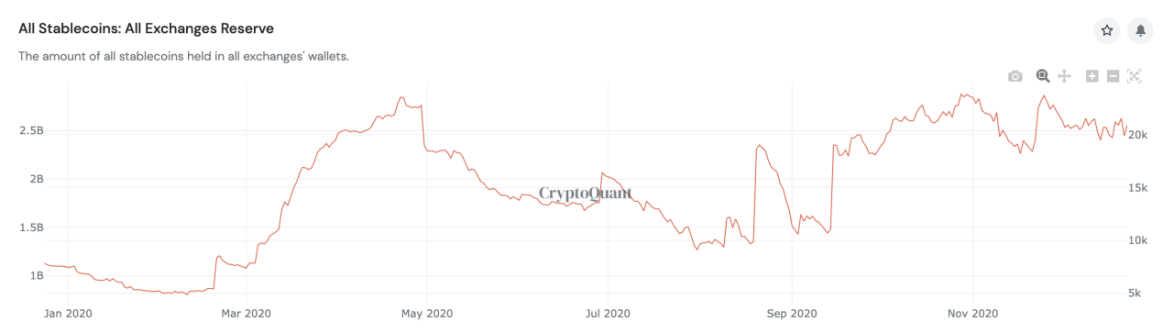 从交易所的余额来看,在牛市环境之下,市场资金总体呈涌入状态。根据CryptoQuant的统计,截至12月23日,所有交易所的稳定币总余额约为25.58亿枚,较1月1日增长了126.67%。近期总余额基本稳定在20亿枚以上。