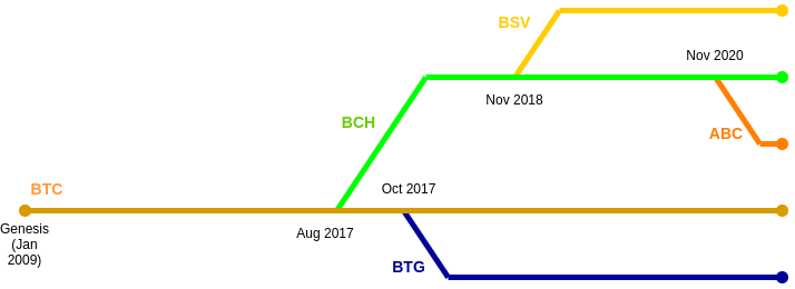 上图展示了主要的比特币分叉历史事件,这个数据截至 2020 年,还不包括 Bitcoin Diamond, Bitcoin Rhodium, Bitcoin Private, 或任何其他长长的其他一些分叉后并不太出名的比特币分叉项目,不过我强烈建议你完全忽略这些分叉,或者卖掉他们(也许你也应该卖掉上面列出的一些分叉,例如 BSV 绝对是个骗局!)