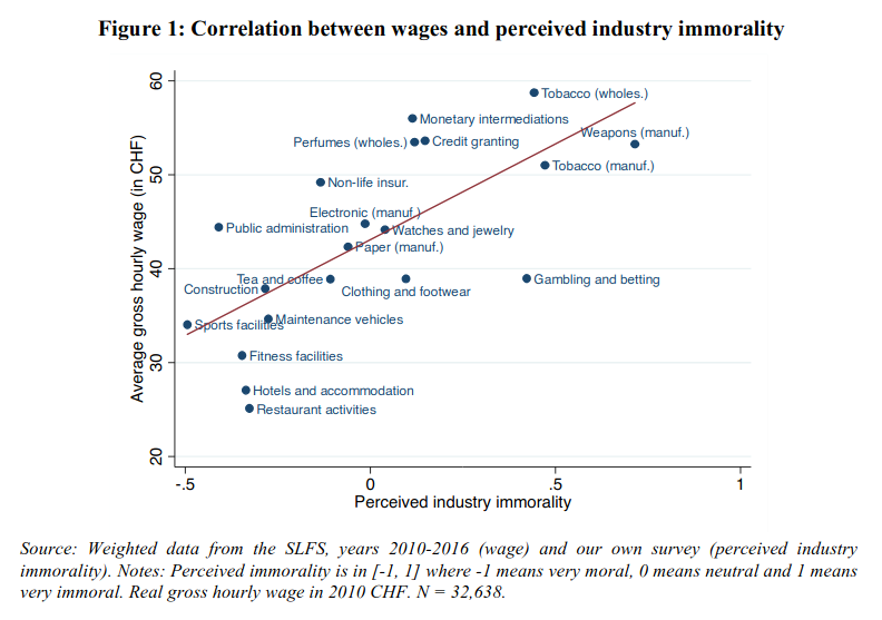 这些差异是非常有意义的,也是可以衡量的。举个例子,请看瑞士的这项关于不道德工作补偿差额的研究:如果一份工作被认为是不道德的,雇主要额外支付多少钱才能说服某人去做这份工作?