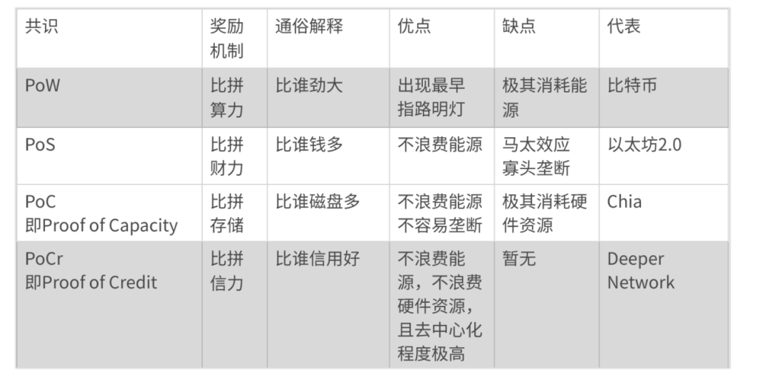 在介绍PoCr之前,我们先比较看看PoCr共识和现有流行的共识机制的优缺点: