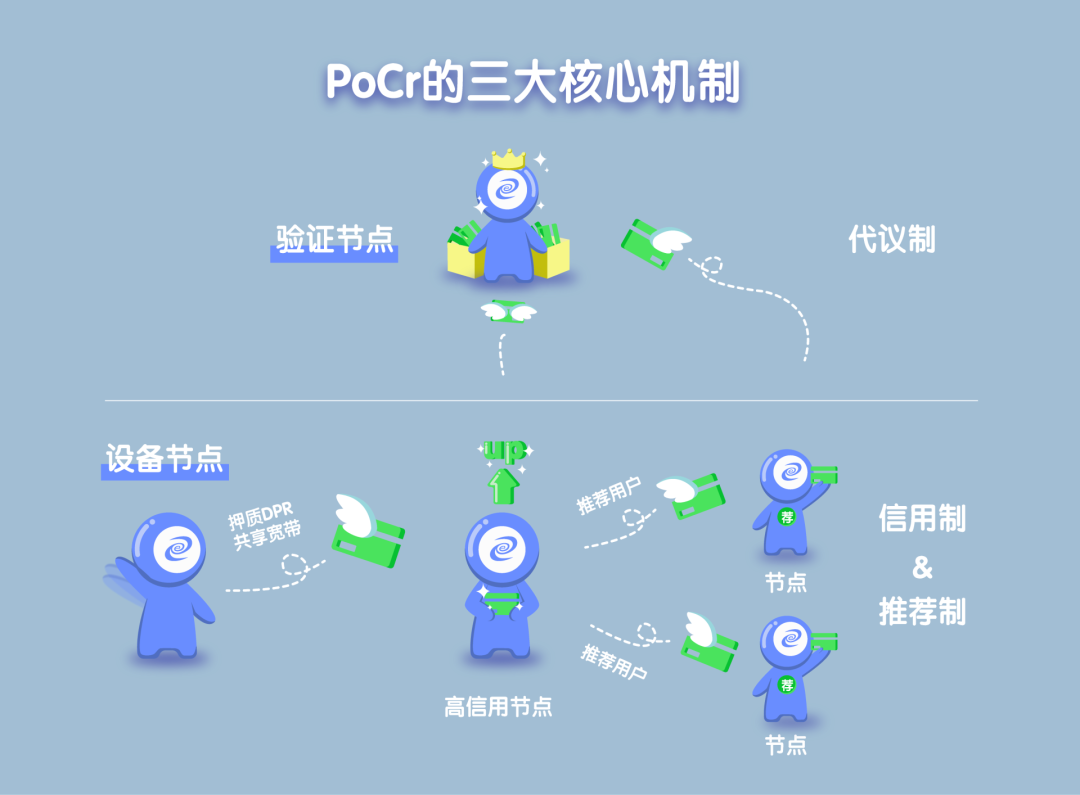 PoCr,全名Proof of Credit,意思是信用证明,在PoCr三个核心机制中信用制是最重要的机制。信用制,顾名思义是根据每个节点信力的多少来体现每个参与者的贡献度,并以此分配出块奖励。