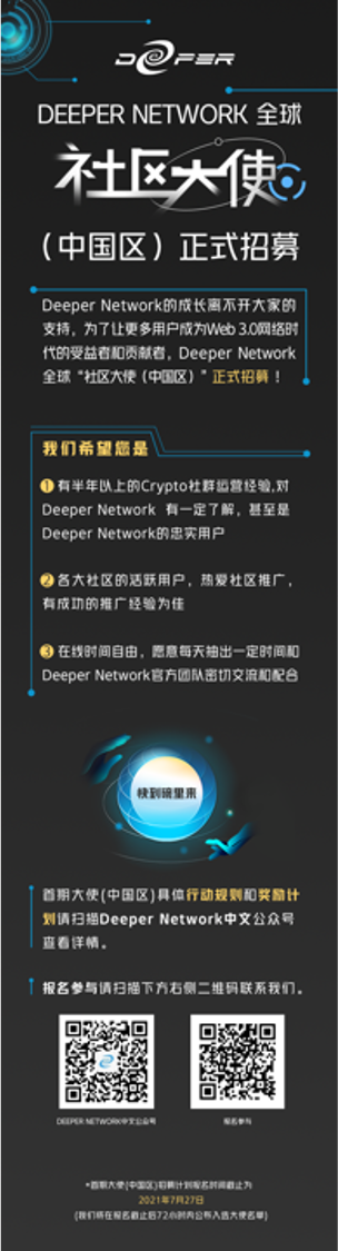 除了普通用户看到的优秀的产品功能,站在更高的角度来看,Deeper Network是重要的Web3.0基础设施,它很早就得到了Web3基金会的投资,并且在2020年入选了Substrate Builders Program,成为了其含金量最高的Infrastructure赛道中的一员。在2021年的波卡首届黑客松比赛中,Deeper Network更是斩获最受社区欢迎奖和决赛亚军两项大奖。