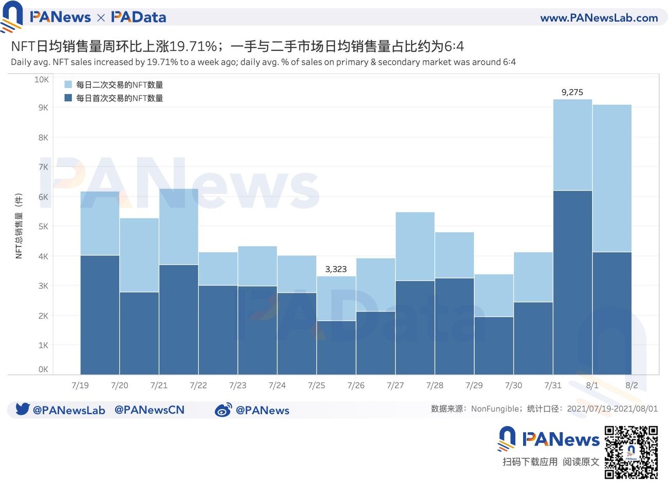 上周,NFT的销售量有所回升。根据NonFungible的数据,日均销售量为5728件,周环比上升19.71%。其中,周末两天的单日销售量都超过了9000件,均为工作日日均值的两倍多。