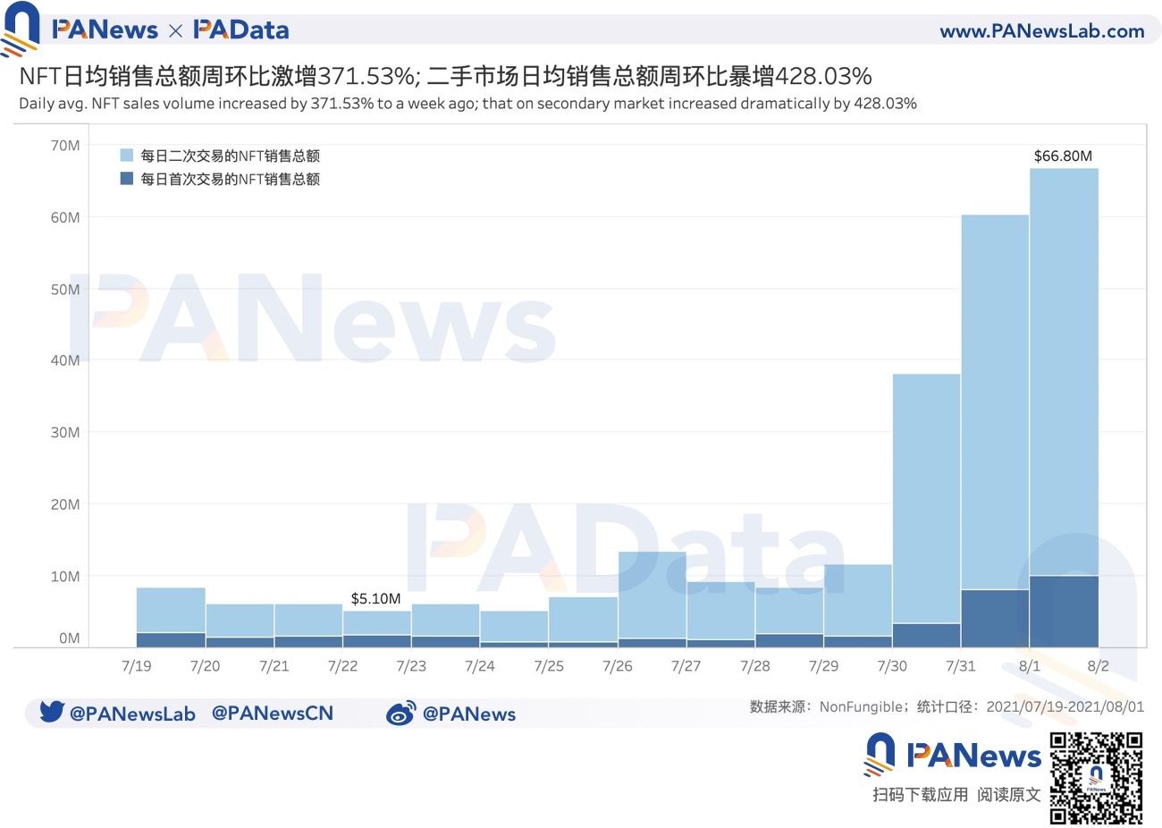 其中,二手市场的销售总额占据绝对的主导地位,一手和二手市场的日均销售总额占比分别为13.69%和86.31%。从金额上看,一手市场日均销售额为392.46万美元,周环比上升176.86%;二手市场日均销售额为2579.15万美元,周环比暴增428.03%。