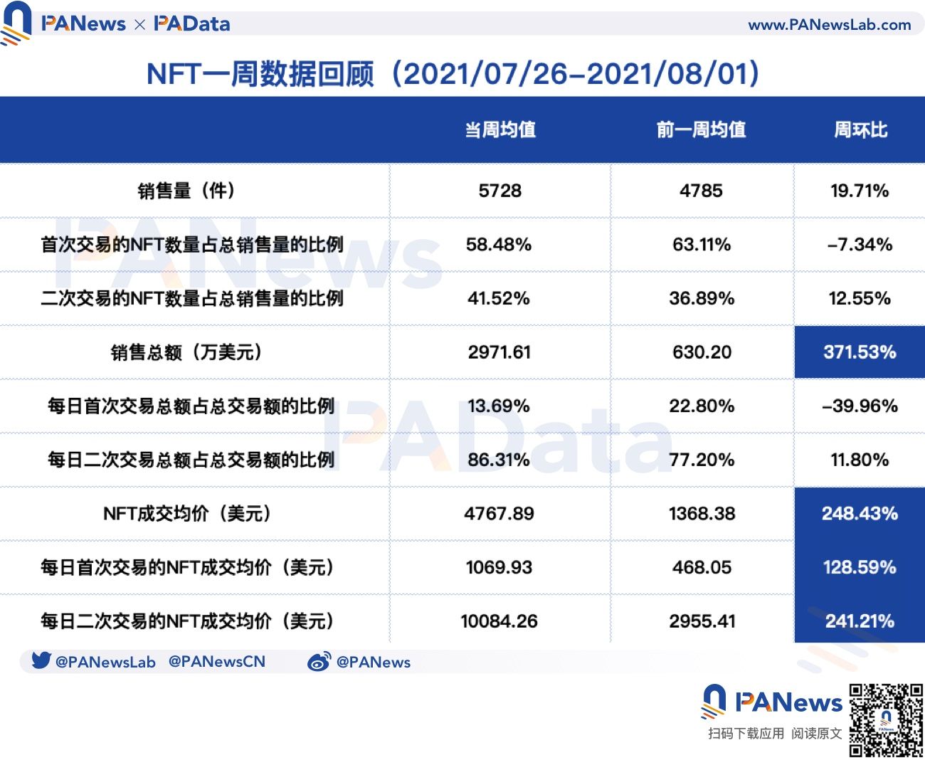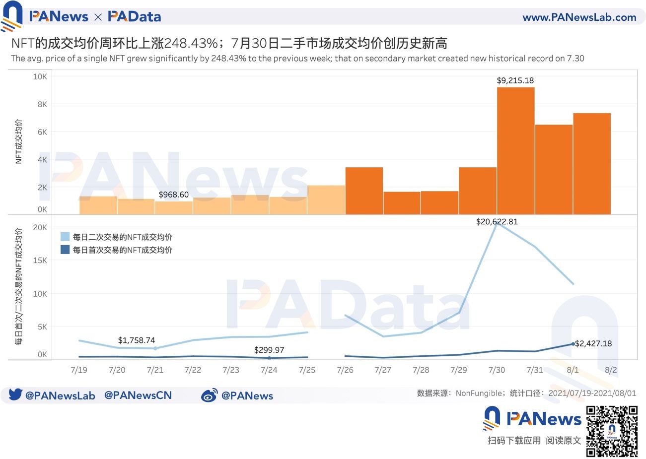 上周,NFT的成交均价为4767.89美元,周环比上涨248.43%。其中,一手市场成交均价为1069.93美元,周环比上涨128.59%;二手市场成交均价为10084.26美元,首次破万元大关,周环比激增241.21%。其中,7月30日,NFT的成交均价为9215.18万美元,二手市场的成交均价为2.06万美元,两者均创单日历史最高价。