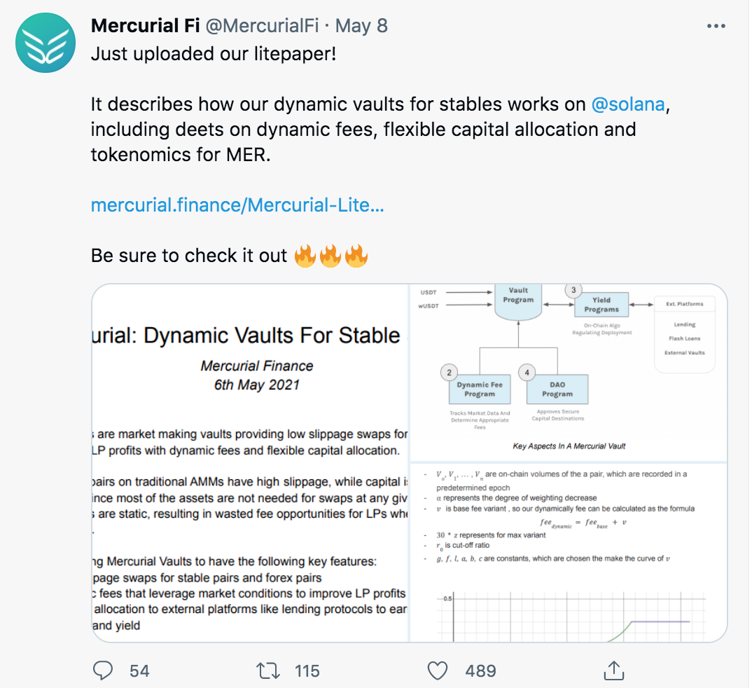 3)生态内链上稳定资产协议。2021年5月,Solana生态项目Mercurial Finance在推特上描述了自己运作方式。Mercurial Finance提供低滑点稳定币兑换交易服务,同时利用动态收费机制和灵活的资本配置提高流动性提供者收益。通过AMM vault为Solana上的原生和wrapped稳定币(USDC、USDT、wUSDC和wUSDT)提供动态费用,目标是帮助改善这些资产的流动性。