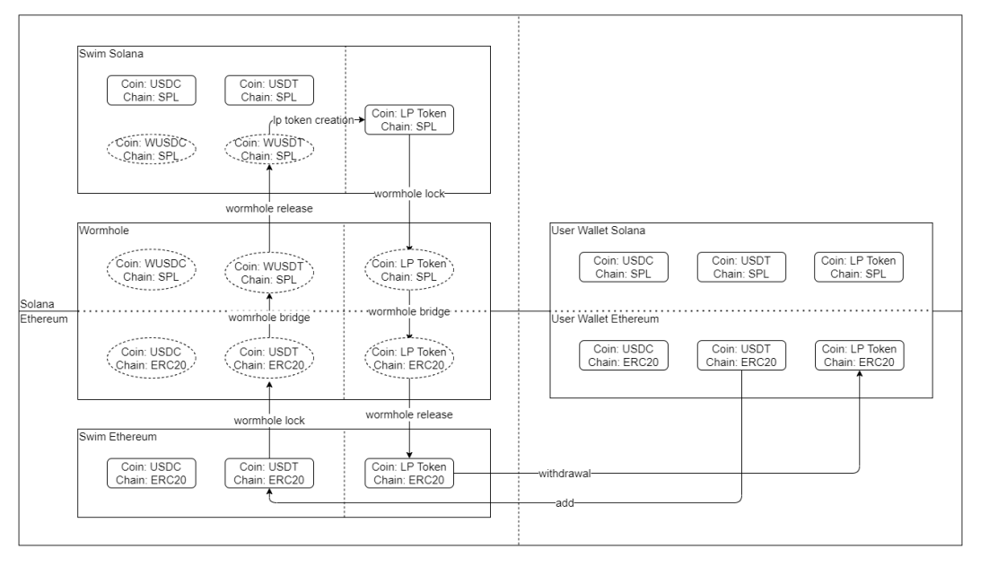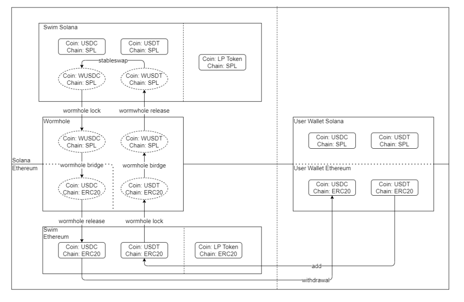 而当Ethereum和Solana的钱包批准Swim合约后,指定的ERC-20资产从Ethereum钱包发送到Swim流动池,Ethereum上的智能合约通过Wormhole将收到的ERC-20资产发送到Solana上的Swim智能合约,在扣除经过算法计算的滑点后,来自Ethereum的资产成功的跨入Solana钱包中。