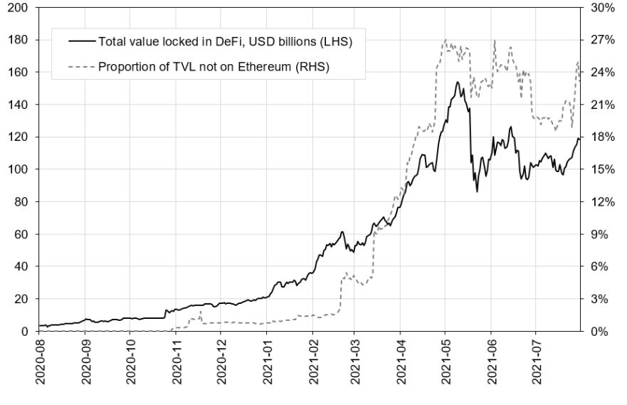 随着去中心化金融协议和智能合约在近两年内呈指数级的增长,Ethereum成了最大的赢家。在2020年初,锁仓在Ethereum上的资金约在10亿美元。而仅仅一年之后这个数字就增长到超1450亿美元。例如Maker、Aave、Compound、Uniswap、Liquity等著名去中心化金融协议开始在Ethereum上萌芽,并帮助Ethereum建立了庞大的市值,成为最大的DeFi生态公链。