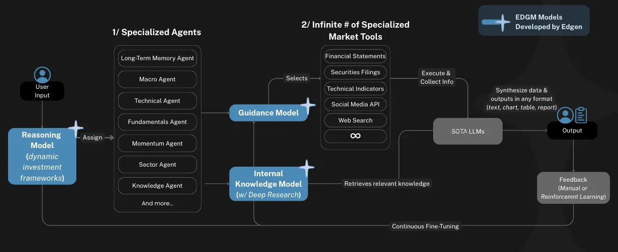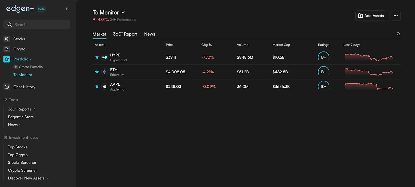 Edgen解决了这一信息鸿沟。该平台通过多智能体系统将复杂的分析任务自动化,并在单一界面内整合股票和加密货币。投资者现在可以毫不费力地获得机构级的分析工具,无需在多个平台上收集和交叉比对信息。