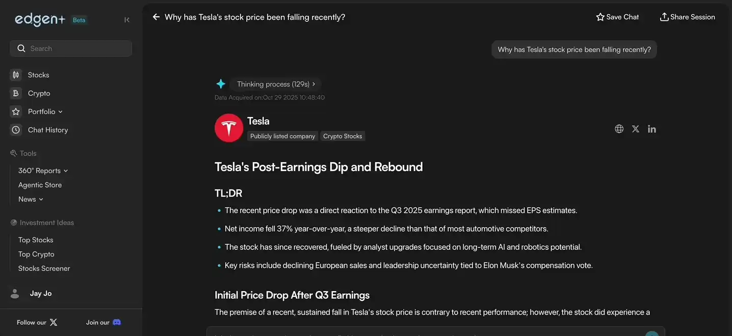 Edgen的搜索功能让投资者能够以对话方式探索市场,而无需直接分析复杂的金融数据。例如,当投资者询问特斯拉的股价最近为什么下跌时,Edgen会同时分析公司的新闻、财务状况、技术指标和市场情绪,并提供综合性的答案。个性化功能在这里同样发挥作用。Edgen从用户搜索历史中学习,识别每个投资者重视的主题、板块和指标,然后逐步为该特定用户定制搜索结果和投资建议。