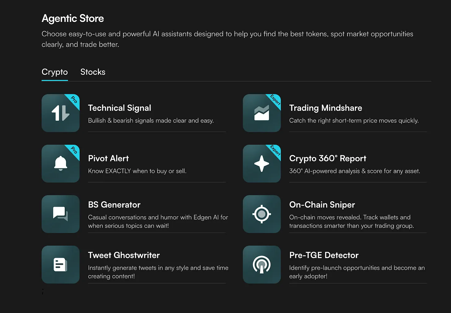 Edgen为需要更专业化分析的投资者提供智能体商店。该商店提供一系列专注于特定投资视角的AI助手。投资者可直接选择并部署与其投资风格和目标相匹配的智能体。