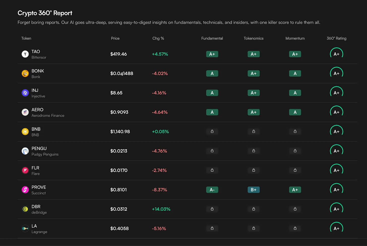 在挖掘投资机会之后,投资者需要工具来深入分析资产并持续监控。360度报告功能自动为单个资产生成综合分析。该系统从估值、增长、盈利能力和动能角度评估股票,从基本面、代币经济学和动能角度评估加密货币。Edgen的专业化智能体分析每个类别,并给出从A+到D-的等级评定。该平台透明地披露分析过程,便于投资者验证每个智能体是如何得出判断的。