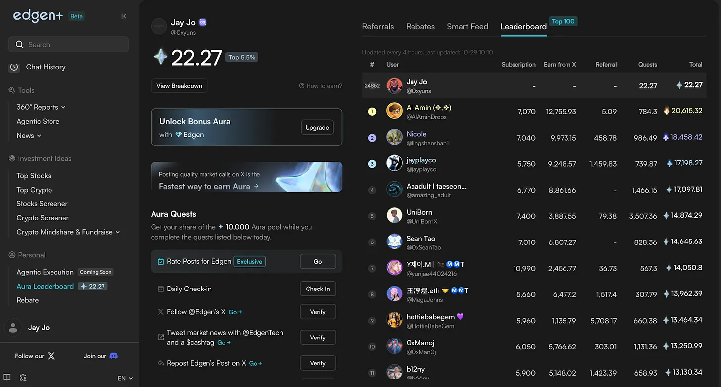 Edgen不仅提供信息,更构建了一个用户直接参与和贡献的开放智能生态系统。Aura系统是这个生态系统的基石。Aura作为一个不可转让的声誉指标,将用户的洞察贡献、预测准确性和社交媒体影响力综合为一个全面评分。