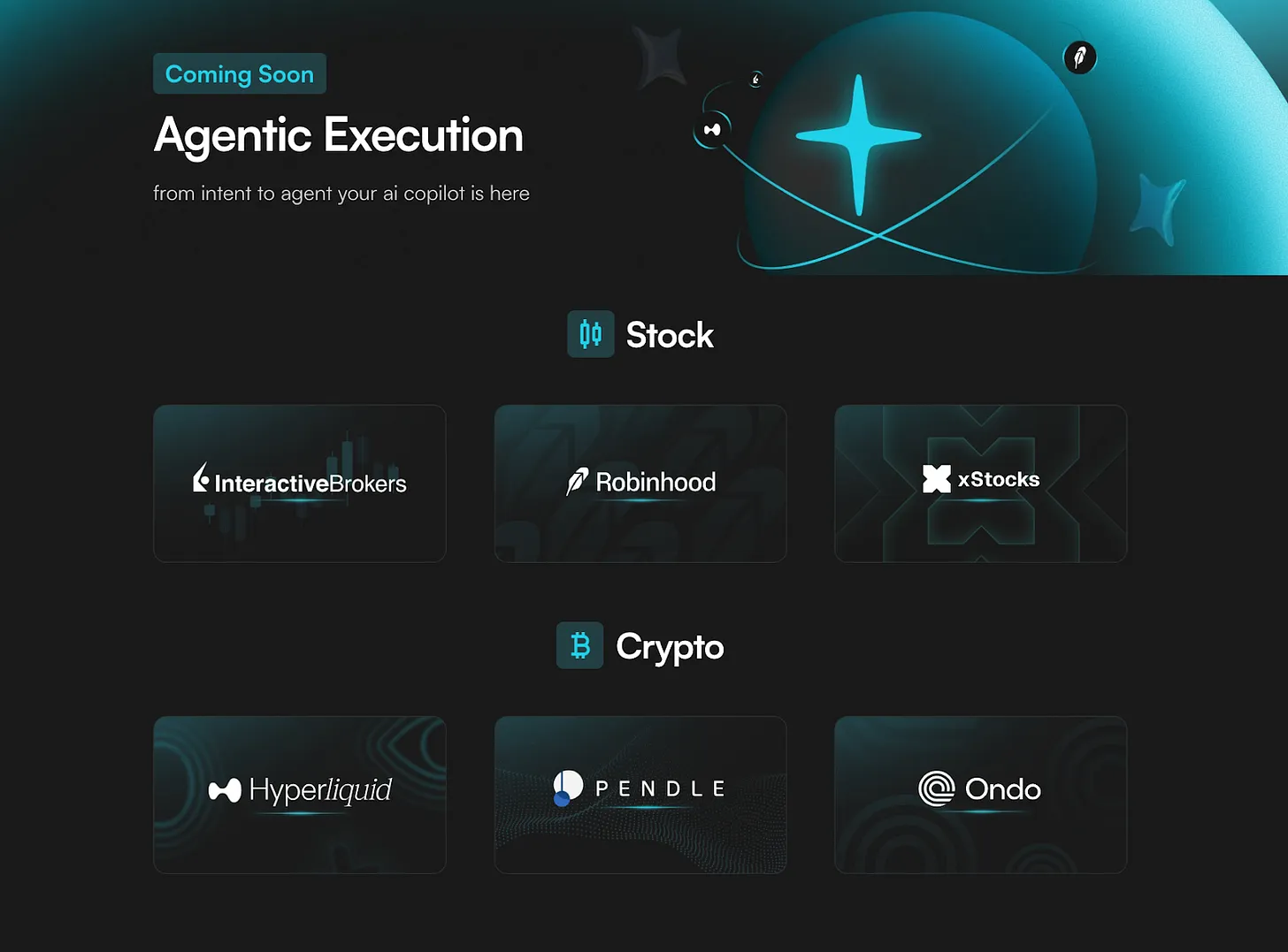 除此之外,Edgen即将推出智能体执行功能,可将投资者的请求自动执行为交易。对于股票,该平台连接Robinhood和XStocks等平台。对于加密货币,它与Hyperliquid和Pendle等协议集成。AI副驾驶理解投资者意图并直接执行交易。通过这一能力,Edgen从智能平台向全面的投资运营平台演进。