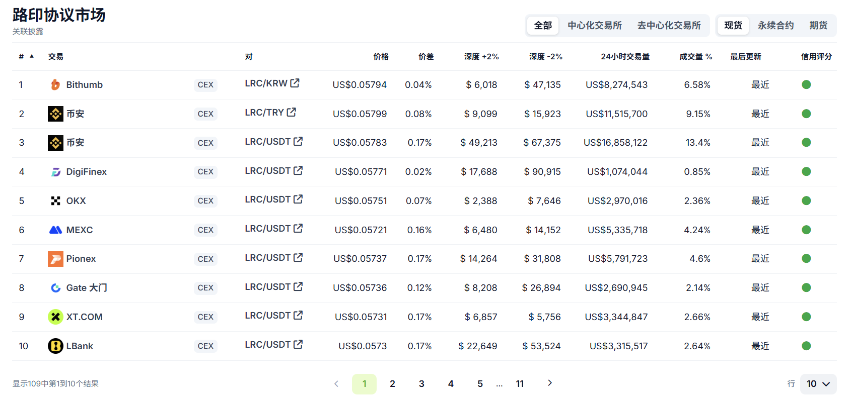 - 集中交易所:LRC 主要在中心化交易所交易。CoinGecko 数据显示,24小时交易量约 1.29亿美元。最大交易所为 Bithumb(LRC/KRW 日成交额886万美元),其次为 Binance 和 MEXC。市场深度相对充足,但部分交易所(如 ProBit)已在 2025年 10月将 LRC 下架。