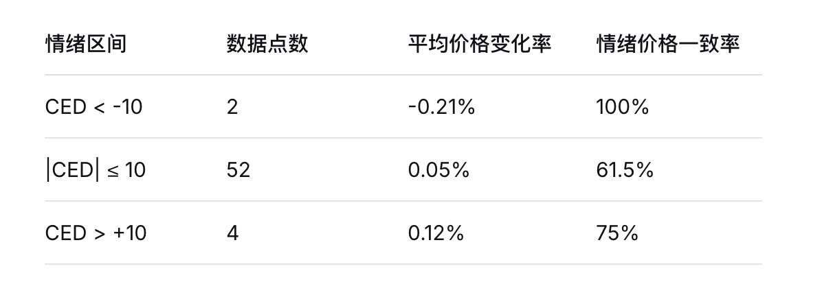 趋势结论:情绪极端负向阶段(CED < -10)价格全部下跌,显示悲观情绪对价格的压制作用明显;情绪极端正向阶段价格上涨概率较高,但涨幅有限。情绪极端化往往预示着价格方向性变化,特别是负向极端情绪对价格影响更为显著。