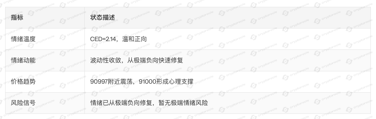 过去24小时内BTC情绪呈现先扬后抑再企稳的走势。整体情绪从早盘的正向极端值逐步回落至负向极端,尾盘出现明显修复。