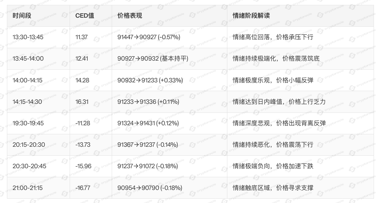 日内情绪变化节奏:上午情绪剧烈波动,从极端正向快速回落;下午情绪持续极端化但价格反应钝化;晚间情绪深度恶化伴随价格下行;尾盘情绪显著修复。