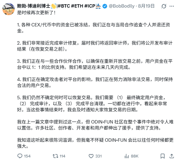 事件详情:8月12日,比特币 meme 币平台 ODIN FUN 因自动化做市(AMM)模块漏洞被利用,攻击者通过添加代币拉高价格后恶意提款,2 小时内平台 BTC 储备从 291 枚骤减至 232.8 枚,团队国库无力全额赔付,且平台已暂停运营并启动安全审计。