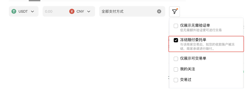 此外,为了方便用户选择,OKX在C2C交易界面增加了专门筛选功能。用户也可以在筛选功能中,直接选择与“冻结赔付”商家进行交易,更快捷更安心。