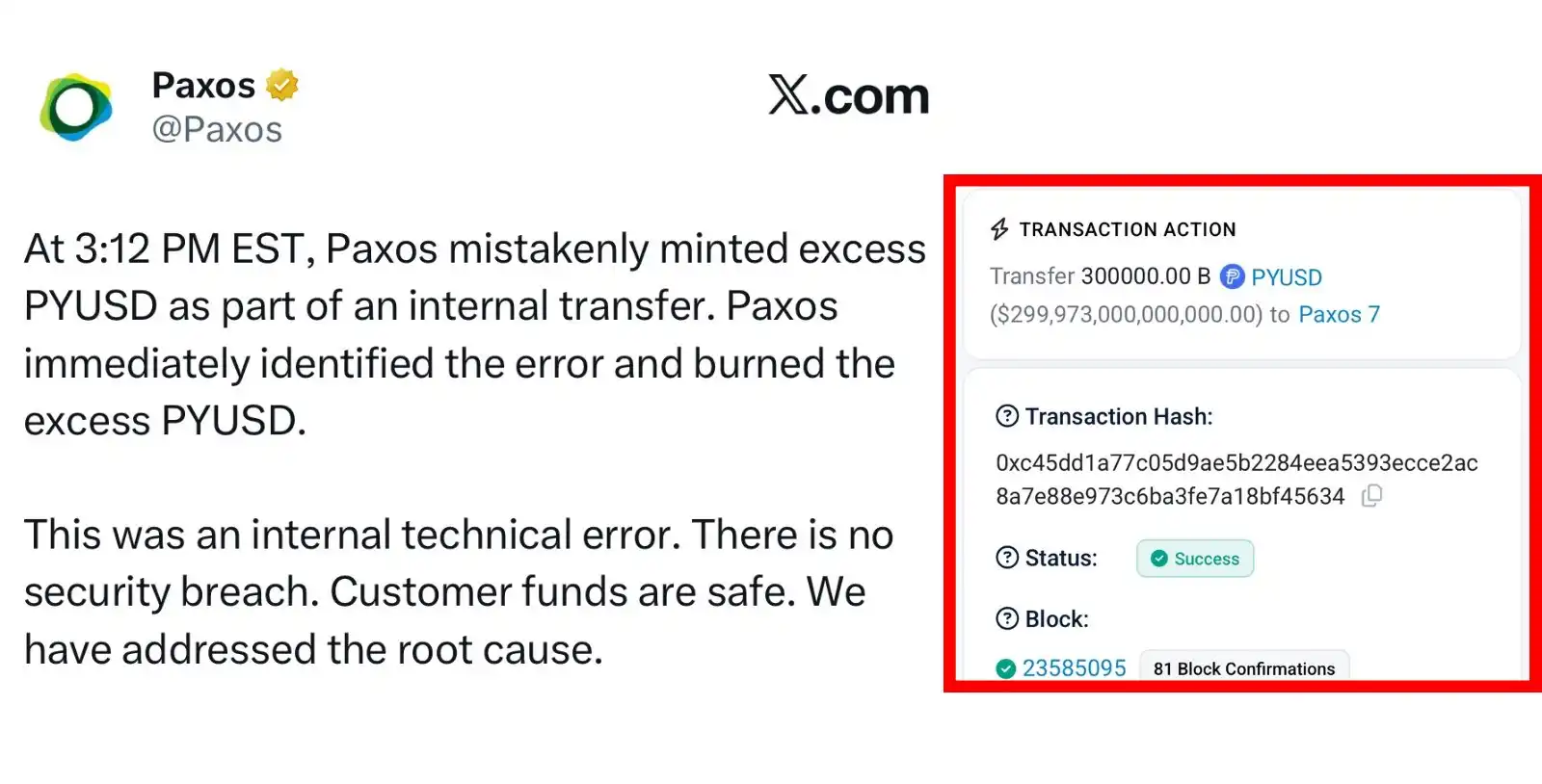 Paxos 误铸 300 万亿枚 PYUSD 后紧急销毁,相当于全球债务总和的两倍多