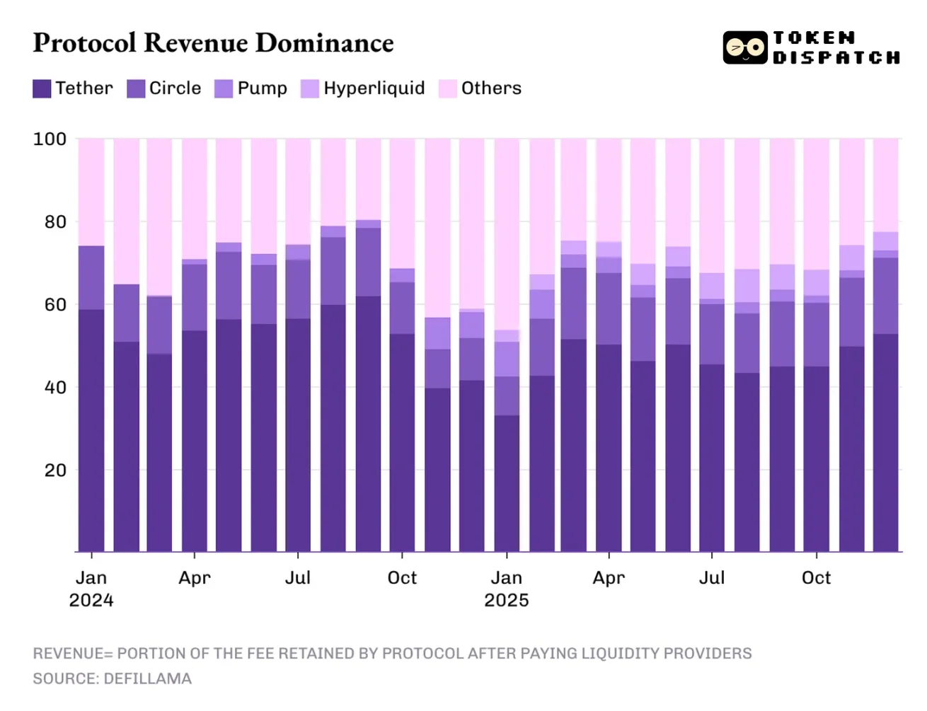 头部两家稳定币发行商 Tether 和 Circle,贡献了加密行业超 60% 的总营收。2025 年,它们的市场份额从 2024 年的约 65% 小幅回落至 60%。