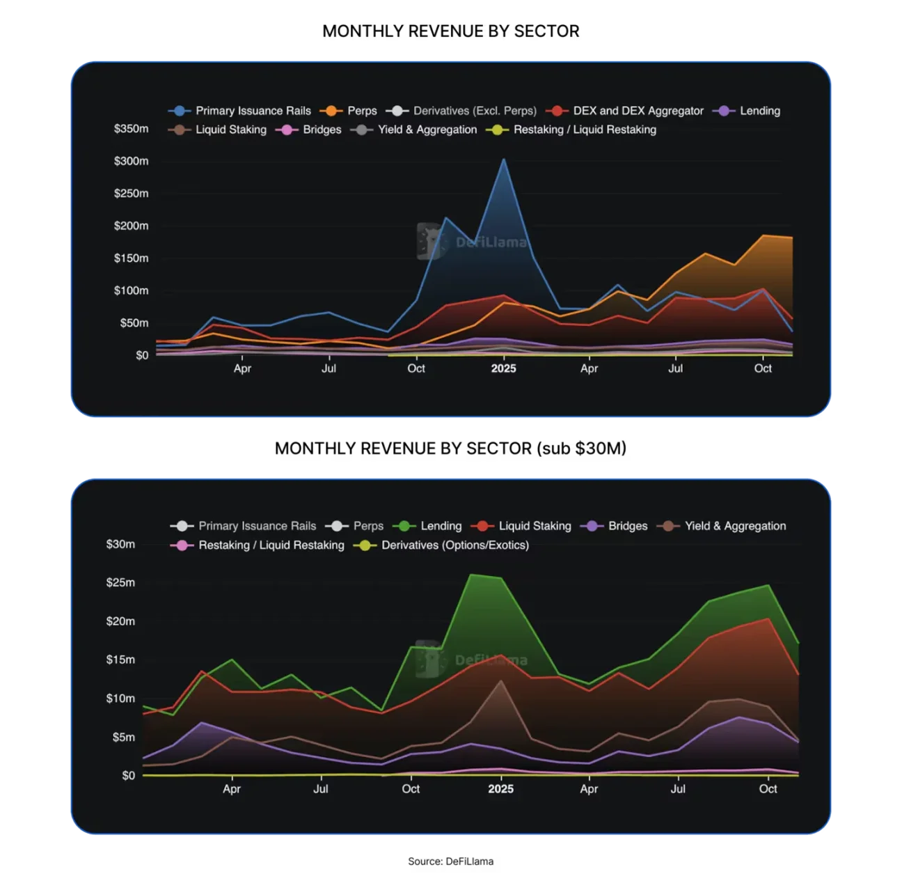 围绕这些节点的趋势分析和报告则更有意思:「这一次,ETF 资金流有所不同」,「加密行业融资今年终于走向成熟」,「比特币今年蓄势待涨」,诸如此类。最近,我翻阅《2025 年 DeFi 行业报告》时,几组关于加密协议如何创造 「可观营收」 的图表吸引了我。