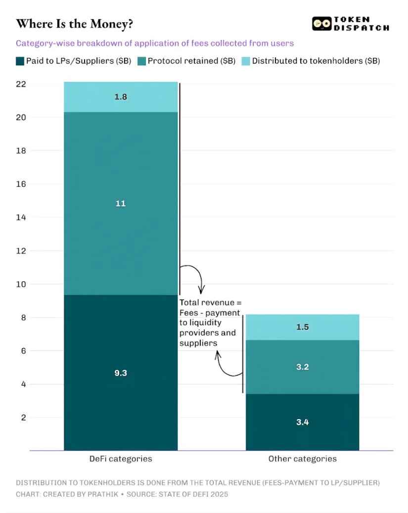 2025 年,去中心化金融及其他协议的用户支付的手续费总额约为 303 亿美元。其中,协议在支付流动性提供者和供应商后,留存的营收约为 176 亿美元。总营收中,约有 33.6 亿美元通过质押奖励、手续费分成、代币回购和销毁的方式,返还给了代币持有者。这意味着,有 58% 的手续费转化为协议营收。