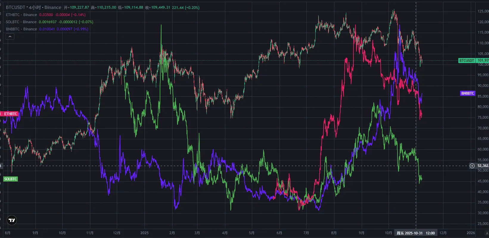 SOL/BTC、ETH/BTC、BNB/BTC 汇率均呈单边下跌走势,后市整体偏中性,但不排除庄币轮番表演的结构性机会。