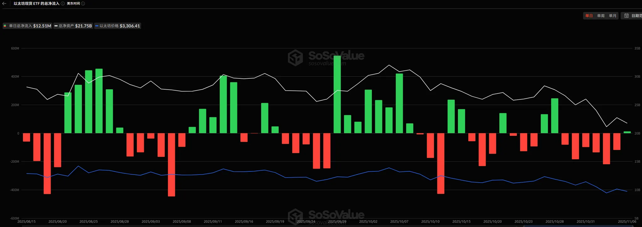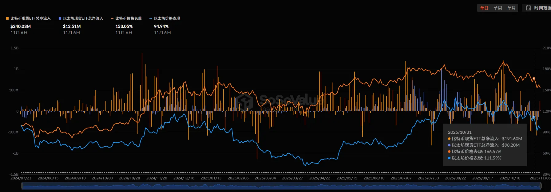 - ETH ETF:本周净流出 5.594 亿美元,上周为 0.2058 亿美元净流入,流出规模显著扩大。以太坊同步跌破日线支撑,11/6 单日净流入量较小,反弹持续性待观察。