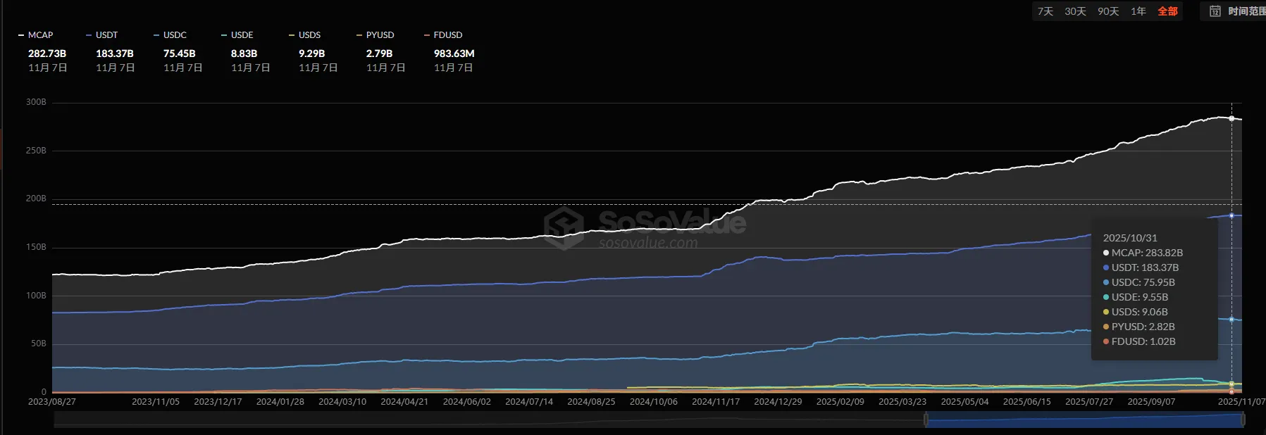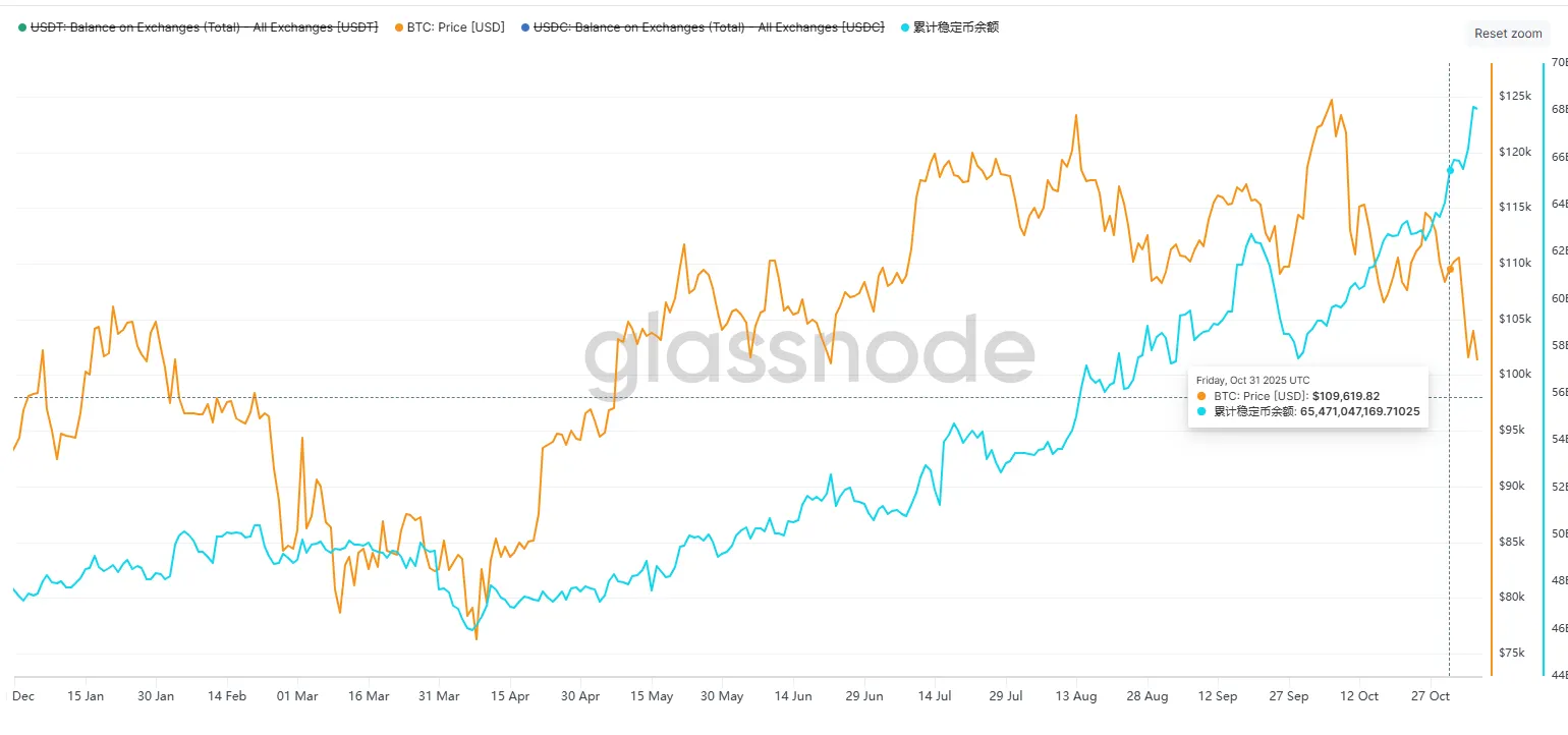 本周(11/1-11/7)稳定币总量 2588.75 亿美元,单周增发量 - 4.82 亿美元(日均 - 0.68 亿美元),为近几个月首次单周负增发。对比上周 3 亿美元的正增发,资金流入明显降温,成为大盘风险信号 —— 回顾本轮牛市,比特币日线级别调整往往伴随稳定币增发减速,本周初大盘同步回落,后续止跌需关注下周增发能否回暖。