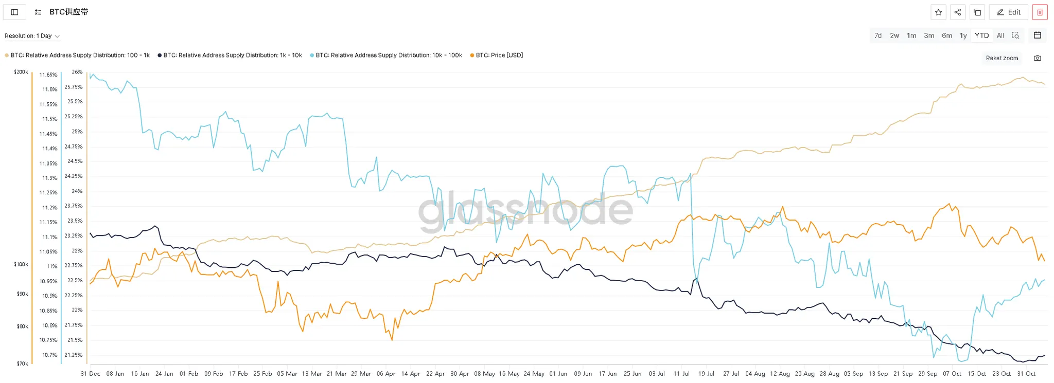 - 100-1K BTC 地址持币占比拐头向下,或出现轻微抛售;
