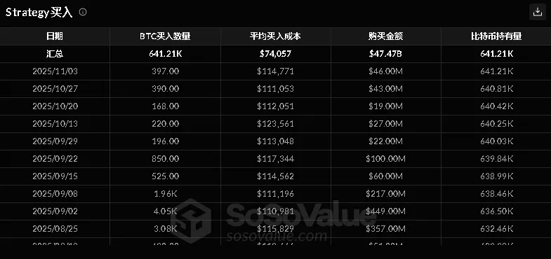 11 月 3 日,微策略花费 4600 万美元,以 114771 美元平均价格购买 397 枚比特币,延续 “小额但高频” 的购币策略。